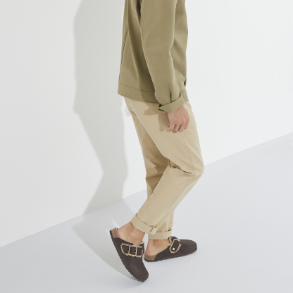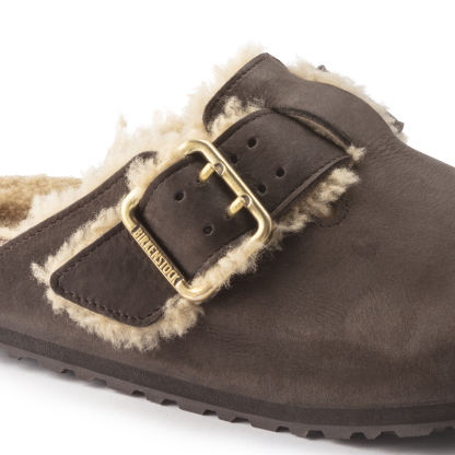 Grand classique, le sabot Boston se porte en toute saison. La présente variante affiche une allure à la fois moderne et urbaine. La fourrure d’agneau frisée est mise en valeur et s’agrémente d’une boucle en laiton. La semelle garantit, de plus, un port confortable et sûr grâce à deux éléments : une semelle intermédiaire amortissante en EVA et une semelle d’usure en caoutchouc véritable qui complète le look. La tige a été confectionnée dans un cuir nubuck doux, haut de gamme.