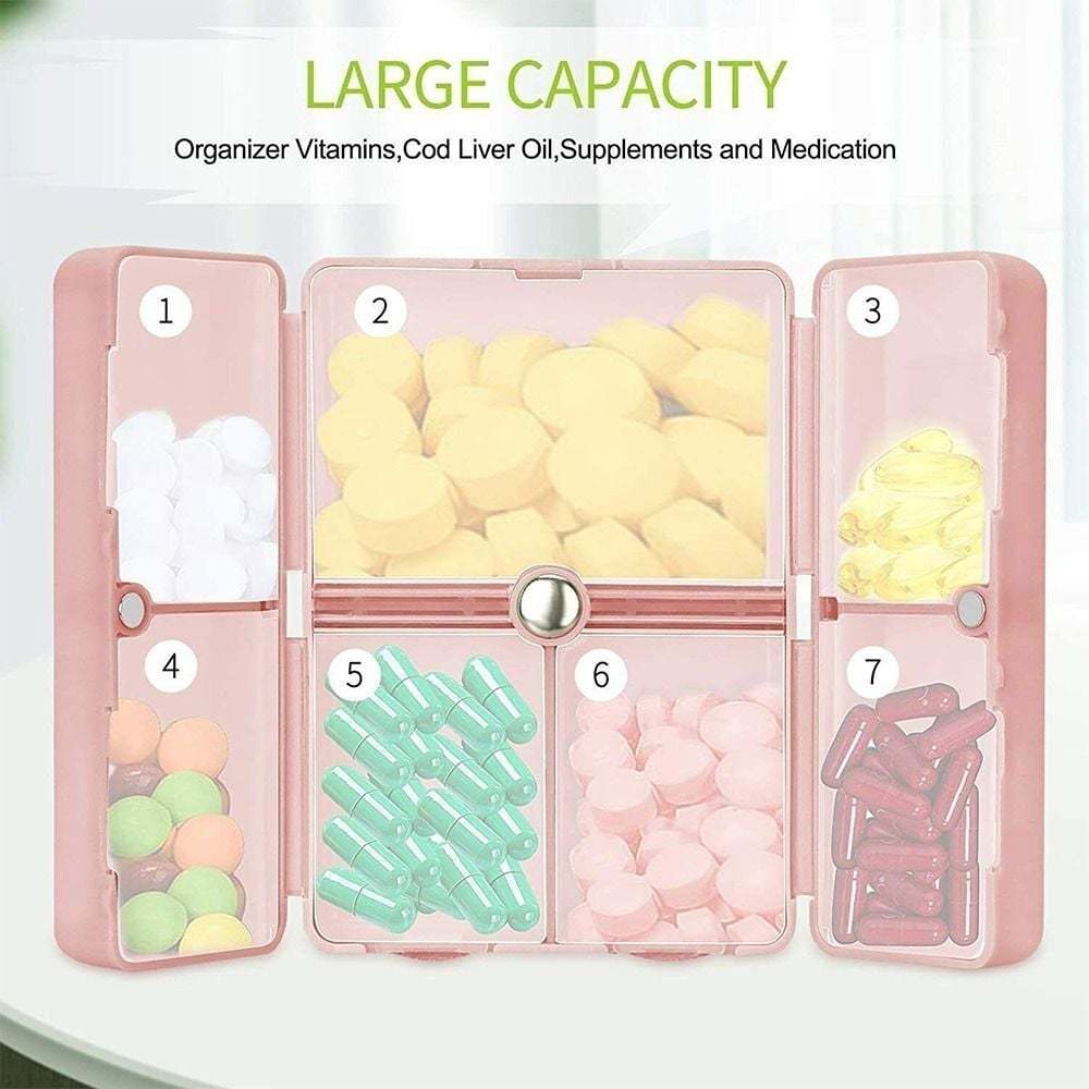 ✨[Large Capacity] Conveniently designed with 7 compartments to help suit your more needs(6 small chambers for little pills and 1 large chambers for vitamins). Different sizes of pills can be placed in different sizes of compartments.With the transparent plastic lid, it's quite easy to distinguish the pills in each dose without opening the lids.