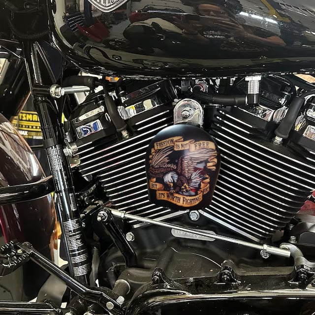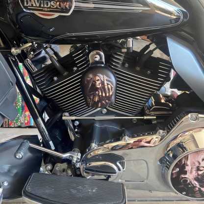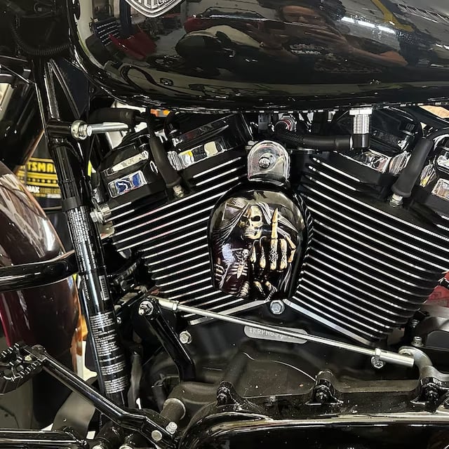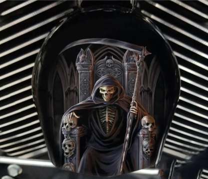 Replace your stock factory cowbell or waterfall style horn with this custom handmade piece, utilizing your existing hardware. The design is hardcoated onto the OEM horn cover, with the design fading to black on the sides to compliment the engine.