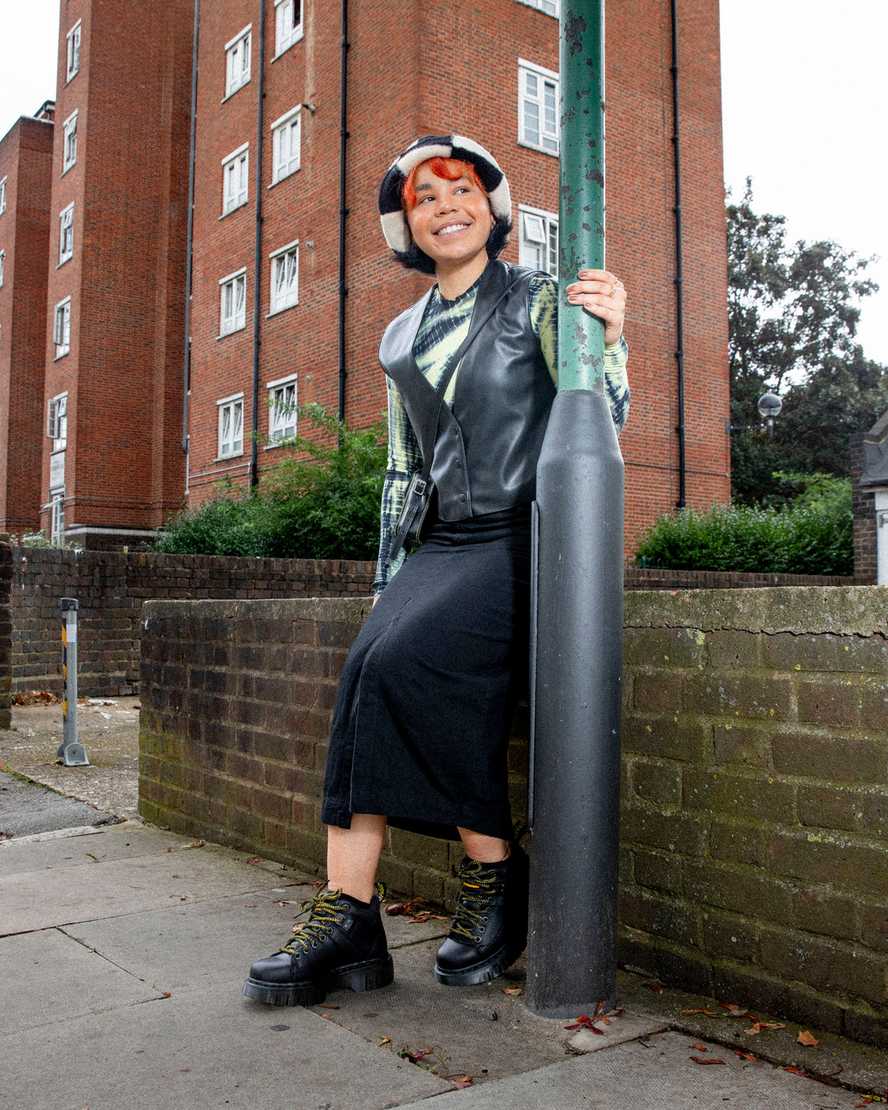 Hiker style with pavement-ready attitude. The new Woodard ankle boot stands on a Club Wedge sole inspired by designs in the DM��s archive �� with signature grooving and a black welt stitch. Fitted with a padded collar for extra comfort, with hiker laces and tonal hardware. The ankle is also tagged with a rubberised version of our black and yellow heel loop.